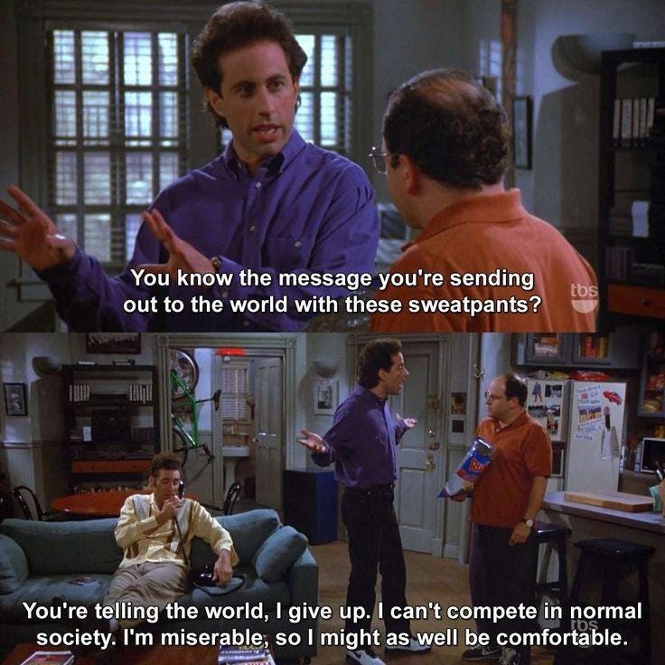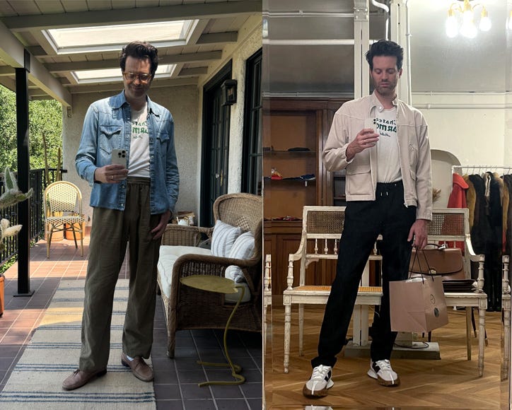 Why should you give a shit how you look in the privacy of your own home? Because it’s an easy win - an uncomplicated way to feel good about yourself. And in the immortal words of the late Karl Lagerfeld: “Sweatpants are a sign of defeat. You lost control of your life so you bought some sweatpants.” I’m not talking about dystopian looksmaxxing here, and I don’t wanna get self-helpy either, but the simple action of making an effort (a minimal one!) to put a good foot forward every day can have a dramatic effect on your spirit and sense of self-worth. I promise you - you can still be extremely comfortable without sweatpants and a hoodie, and once you get your staple pieces in order, it’s just as easy.